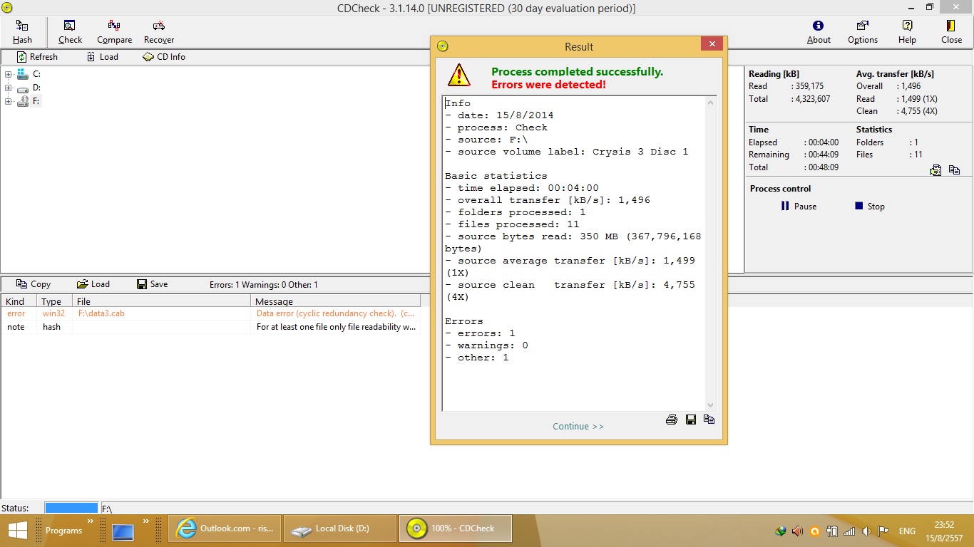 ปรากฎว่า เกมส์ crysis3 แผ่น1 มีปัญหาครับ ลงแล้วค้างที่18.84% คิดว่าเป็นที่ตัวแผ่นครับ เพราะลองหงายแผนดู เจอเนื้อเงินในแผ่นมีรอยเป็นหลุมครับ ตามในภาพ